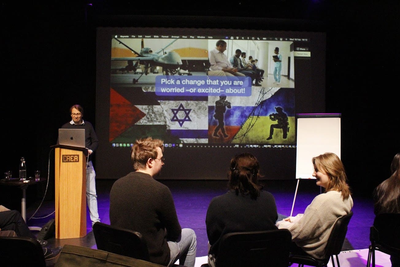After the lecture, guests can either attend the workshop or join the network borrel. Curious about the workshop, I joined systemic coach Oscar Westra van Holthe. His workshop seeks to bring the theory of the day together and bring it to life in practice. Inspired by his experience in coaching individuals on how to bring about and deal with systemic change, his workshop draws parallels between individual and societal changes. We gather in groups of three and choose one societal change that we feel particularly strong about. Oscar guides us through an analysis of this change by use of his self-developed model of systemic transition. By identifying the different actors active within a system, their respective (power) relationships, and ways in which better and/or different paths of change can be created, we gain new insights into the nature of change, where we can find resilience, and how to identify our own role within these changes.