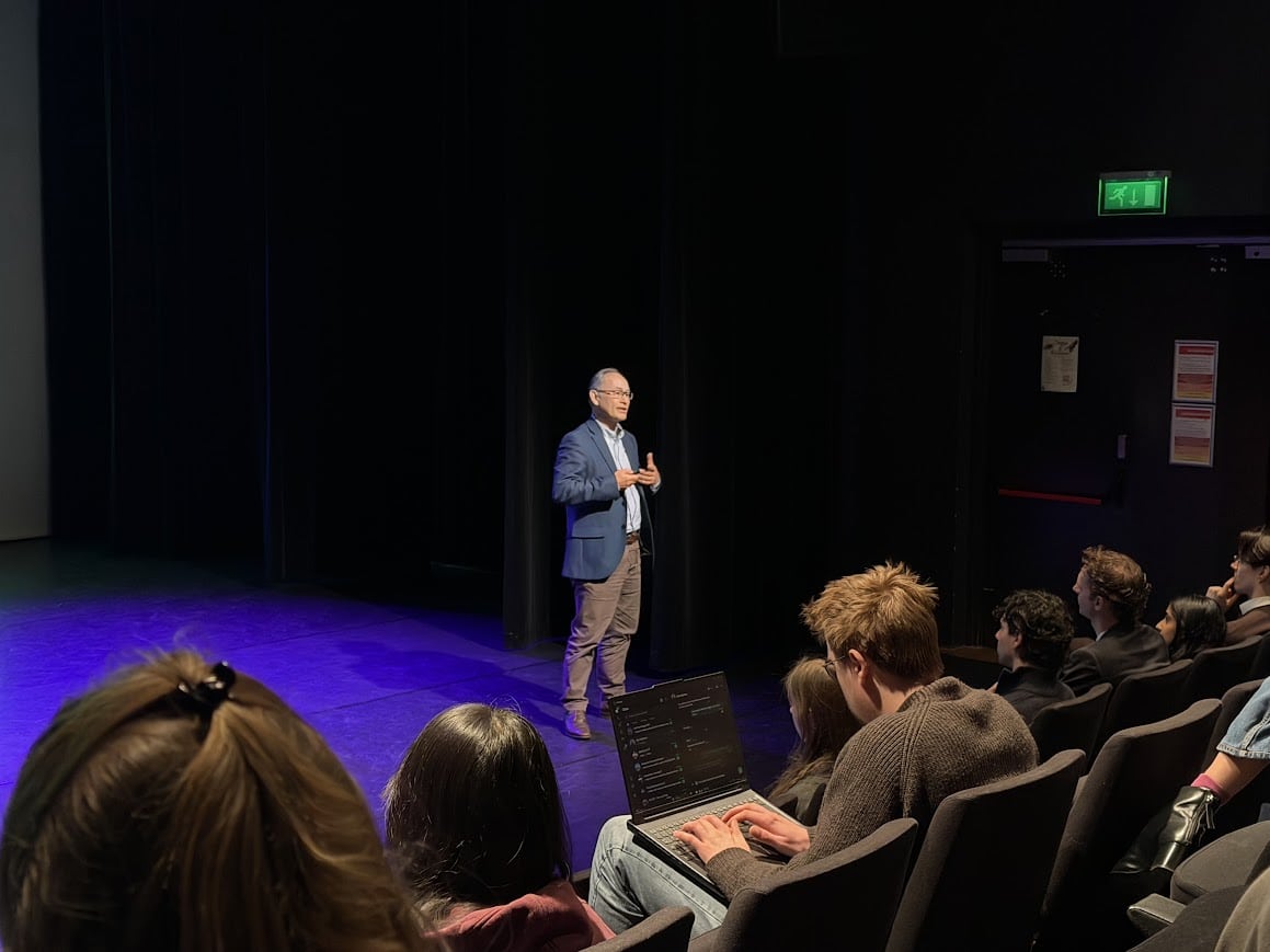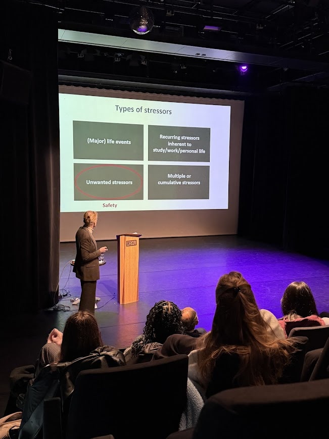 When students and speakers have arrived, Dr. Richta IJntema is introduced. Her lecture provides the attending students with tools on how to think about resilience and challenges the idea of resilience as a trait. Instead, resilience is a dynamic process shaped by the lifecourse, aimed at changing pre-stressor functioning to adapt to stressful situations. Her key message: building resilience is not done alone. True resilience grows in connection with others.
