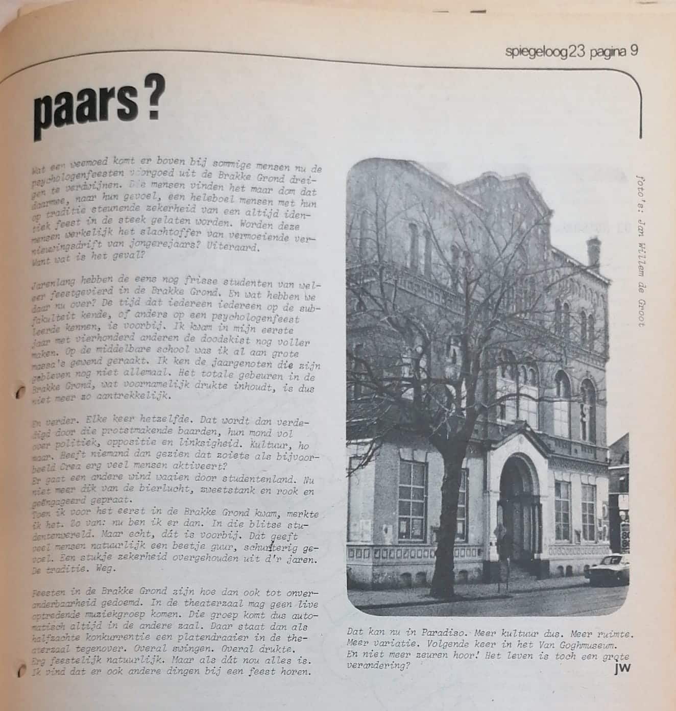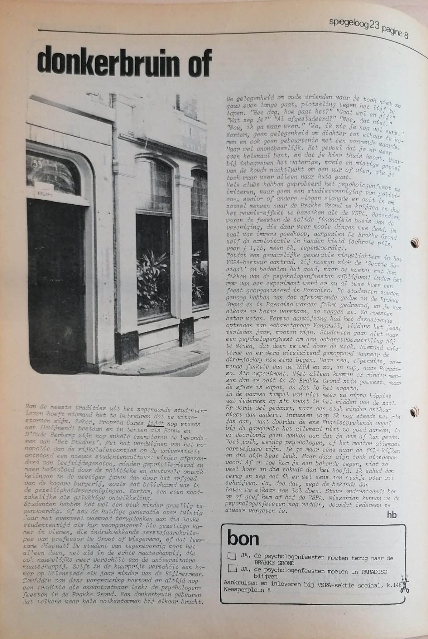 Until a dangerous generation of newcomers joined the VSPA board. They call themselves the ‘Social Section’ and mean well, but they should keep their hands off the psychology parties! Under the guise of an experiment, a party has now been organised twice in Paradiso. The students have had enough of the dull fuss in the Brakke Grond and films are shown in Paradiso, and you can understand each other better there, they say. They should have known better. The first clue should have been the disastrous performance of cabaret group Bangrail during last year’s party. Students don’t go to a psychology party to attend a cabaret show; they do that during the week. No one listened, and there was only grumbling about when the DJ would finally start. But no, stubborn, formative function of the VSPA and all, and off we went to Paradiso. As an experiment. Not only did fewer people show up than ever had at De Brakke Grond, but the atmosphere was ruined, and that’s the worst part.